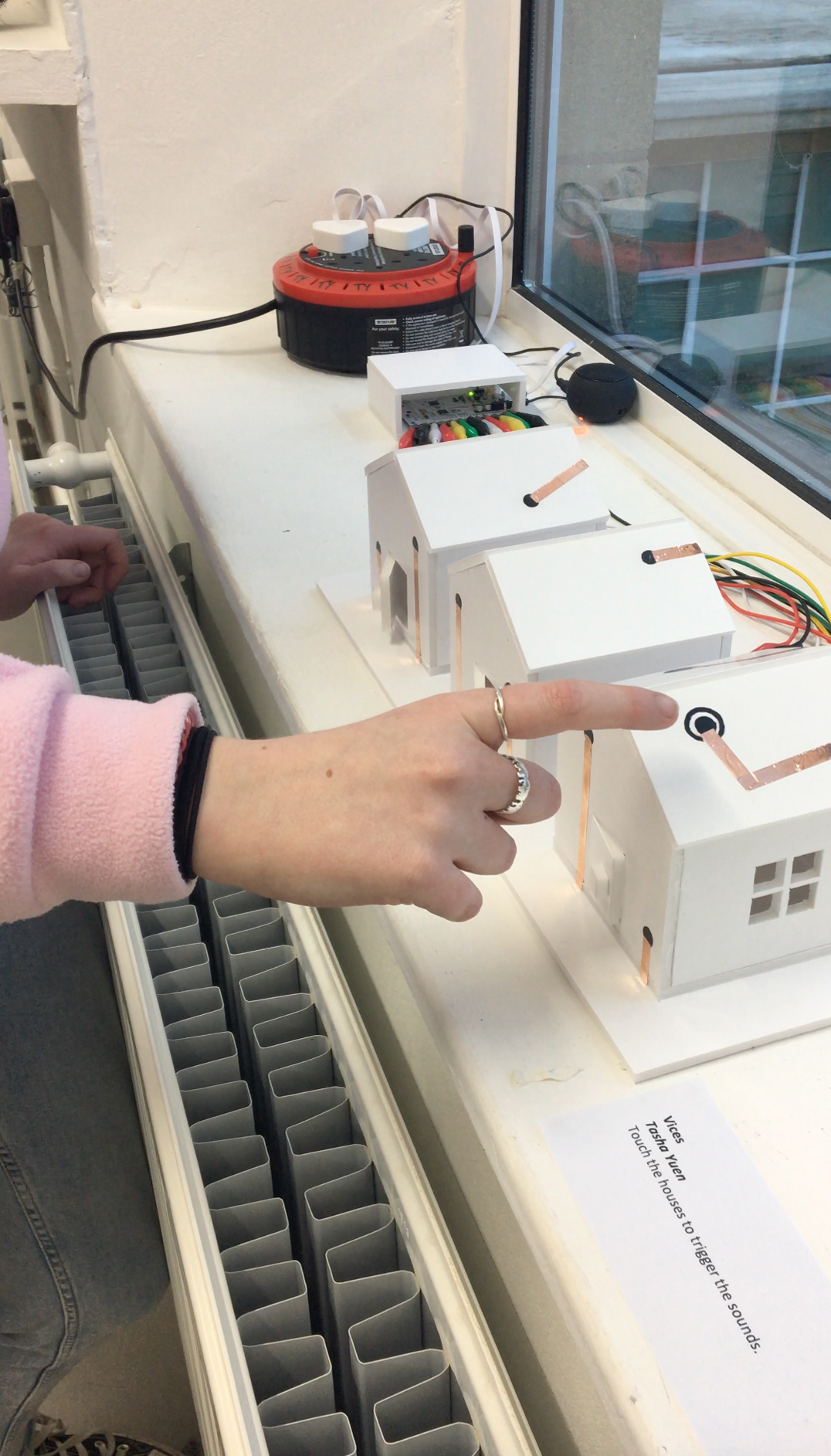 The end result of this project was a set of 3 houses, constructed using foam board, BareConductive Touch Board and electric paint and copper tape.